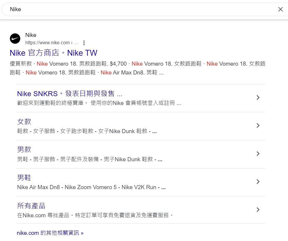 Sitelinks 就是 Google 在搜尋結果中,額外提供的網站內部連結,通常會出現在品牌名稱或熱門關鍵字搜尋的結果下方。例如,當你搜尋「Nike」,可能會看到「女款」、「男款」、「所有產品」等網站連結,這些都是 Sitelinks,幫助使用者更快找到想看的內容,減少點擊步驟與降低跳出率,改善整體使用體驗。